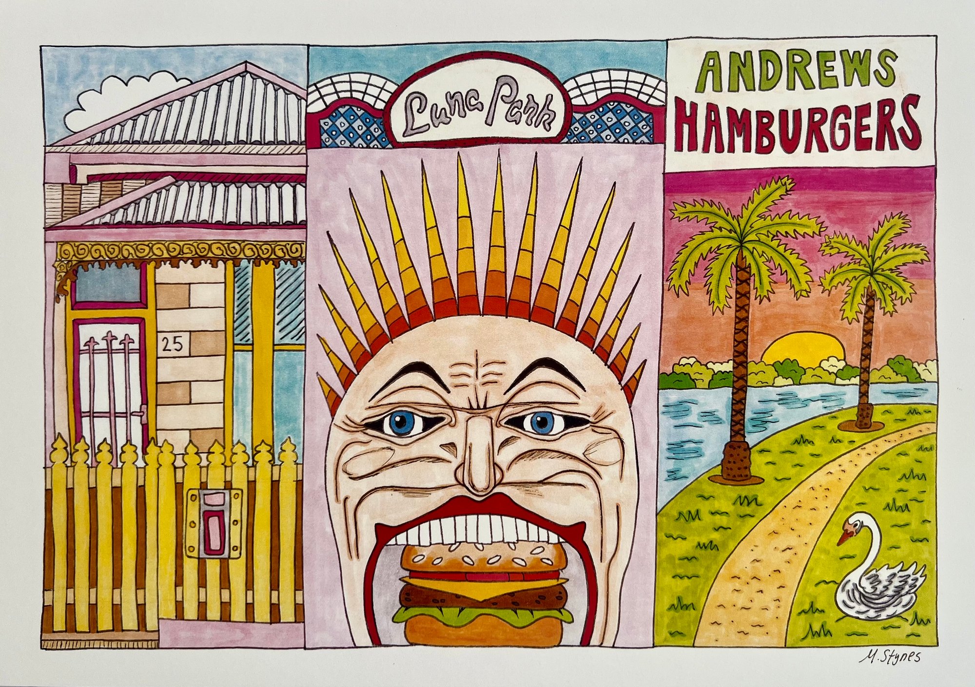 Each print begins as a drawing of a place that holds personal meaning. Taken on my iPhone, a handful of photos are reimagined into a hand-drawn, collage-style composition. Using markers and pen on paper, I bring together three to six images to create a piece that captures the most essential elements of that place.