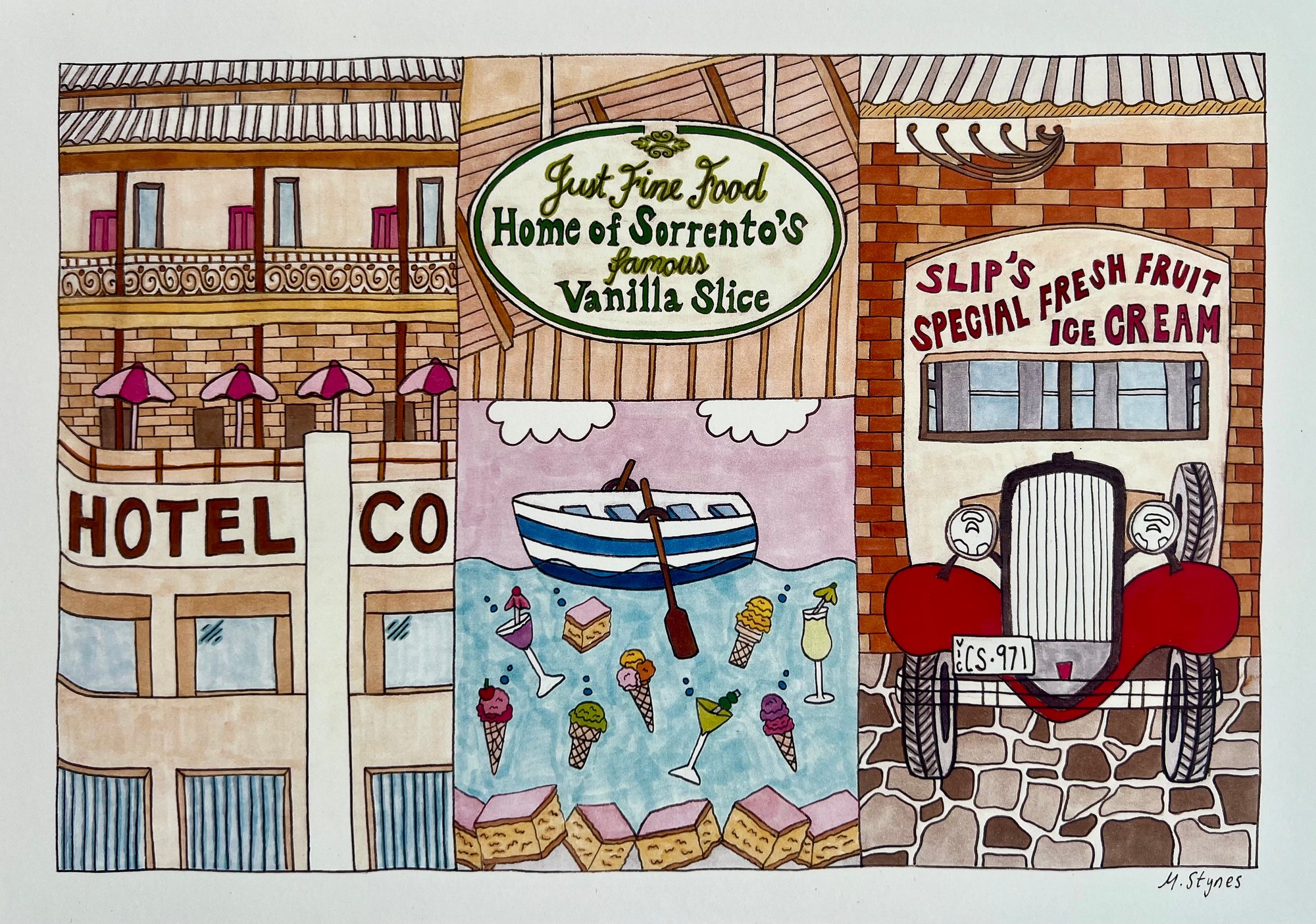 Each print begins as a drawing of a place that holds personal meaning. Taken on my iPhone, a handful of photos are reimagined into a hand-drawn, collage-style composition. Using markers and pen on paper, I bring together three to six images to create a piece that captures the most essential elements of that place.